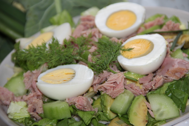 Her helgrønn salat med forskjellige salattyper, agurk, purre, dill og avocado med saltede egg,